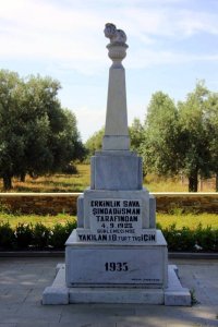 Bu şehitlikte yer alan anıtta "Erkinlik Savaşı'nda düşman tarafından 04.09.1922 günlemecinde yakılan 10 yurttaş için 1935" yazmaktadır.